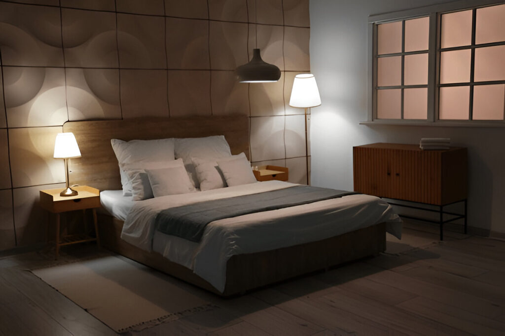 Ιδανικό: Φωτιστικό οροφής και κομοδίνου, ίσως dimmable για ρύθμιση έντασης.